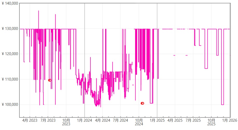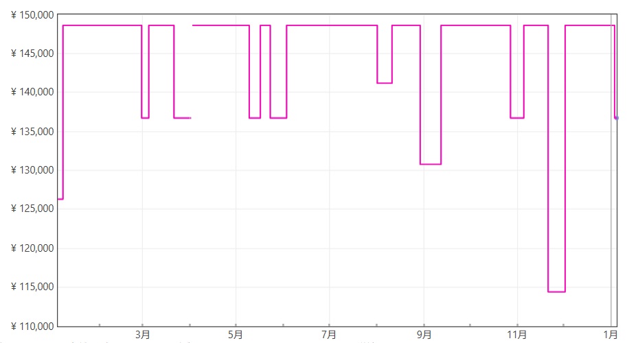逆に言えば、その後12月中旬から年末にかけて、さらに下がる可能性は低めです。あくまで今までの値動きからの推測ですが、待つのは12月中旬までで十分。ポップインアラジン2の時は、本体のみで2021年12月15日、20000円引きまで行きました。